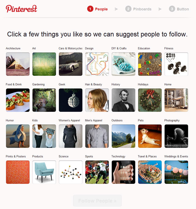 Il quarto passaggio ci suggerisce gli utenti da seguire, selezionati tra i più cliccati tra quelli delle categorie che abbiamo scelto in precedenza. Il sistema ci assegna automaticamente come followers dei nostri amici di Facebook presenti su Pinterest (sempre se abbiamo sincronizzato le due piattaforme) ma è possibile rimuovere la sottoscrizione in qualsiasi momento.