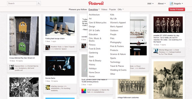 Se la prima schermata di Pinterest ci mostrava gli argomenti che abbiamo scelto di seguire, posizionandoci con il mouse sul pulsante nella barra in alto “Everything” possiamo spaziare su tutti gli altri argomenti presenti sulla piattaforma, gli stessi che abbiamo incontrato nella fase di iscrizione.